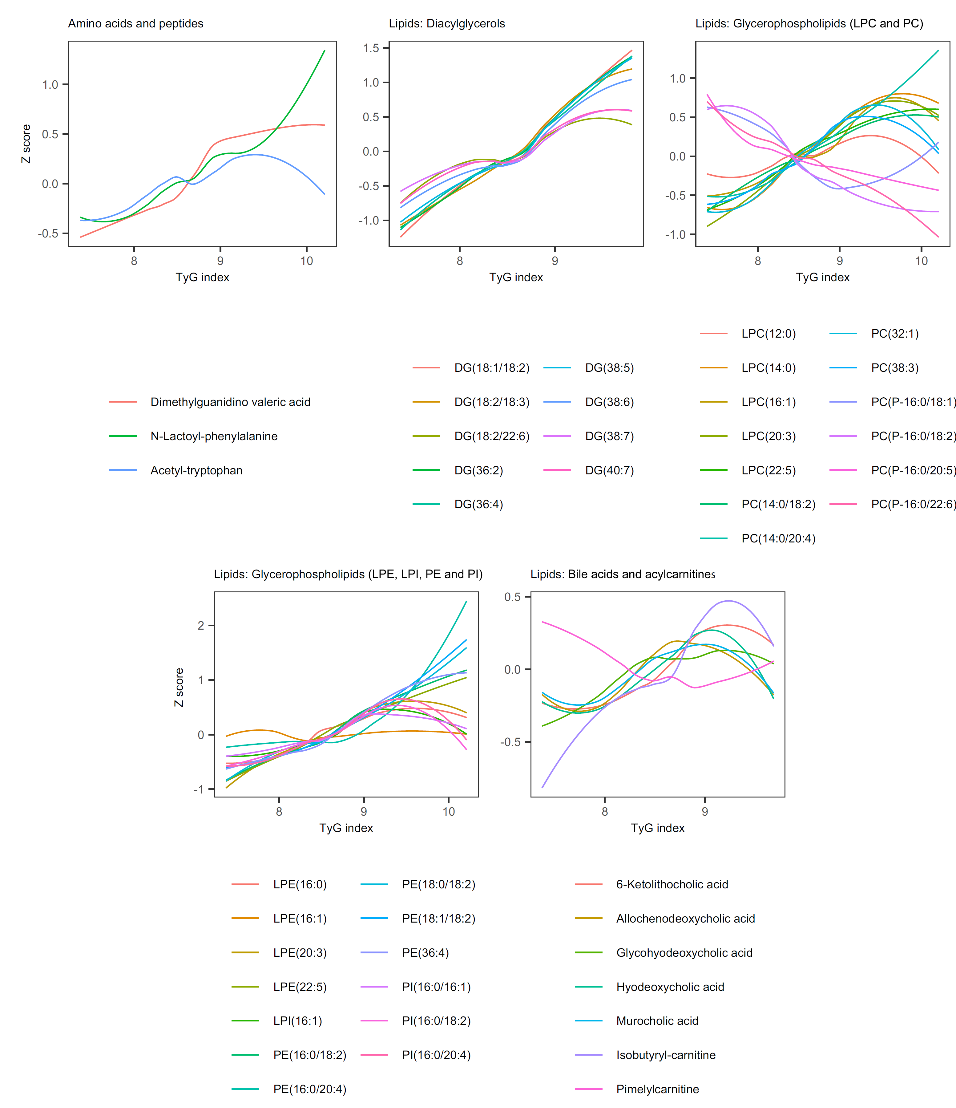 個(gè)體代謝產(chǎn)物與臨床指標(biāo)之間的相關(guān)性分析表明,更多的代謝物顯示出與胰島素抵抗指標(biāo)TyG指數(shù)的相關(guān)性,TyG相關(guān)代謝產(chǎn)物顯示與TG/HDL比率相關(guān)的特征重疊(圖3D)。此外,氨基酸衍生物DG、甘油磷脂和膽汁酸與胰島素抵抗(TyG指數(shù)和HOMA-IR)和胰島素敏感性(QUICKI)密切相關(guān);乙酰色氨酸、二甲基胍戊酸和N-乳糖基-苯丙氨酸,也與TyG指數(shù)密切相關(guān)(圖4)。除LPC(24:0)和LPC(24:1)外,甘油磷脂與TyG指數(shù)呈正相關(guān),而LPC、LPE、PC、PE的醚脂則呈負(fù)相關(guān)。幾種代謝產(chǎn)物,包括乙酰色氨酸、二甲基胍戊酸和N-乳糖基-苯丙氨酸,也與TyG指數(shù)密切相關(guān)(圖4)。